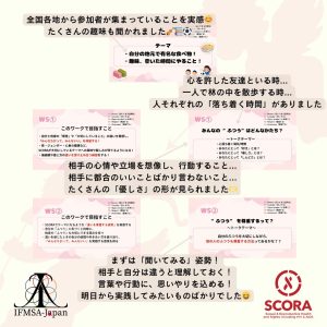 全体を通して、SCORAのあたたかい雰囲気を感じていただくことができるイベントとなりました。まず参加者の緊張を和らげるためにアイスブレイクを行いました。その後、SCORAで大事にしている「みんなちがって、みんないい」という考え方を実感していただくことを目的に、2つのワークショップを行いました。