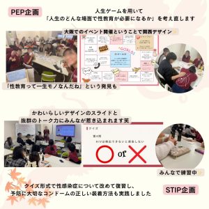 初めにPEPについて説明した後に、PEP Staffで作成した「たこ焼きと性教育と時々わたし~SCORA版人生ゲーム~」を通して、人生のどんな場面で性教育が必要になるかを考え直しました。人生ゲームの中で感じたことを班の中で共有し、性教育の必要性を再認識する機会となりました。
